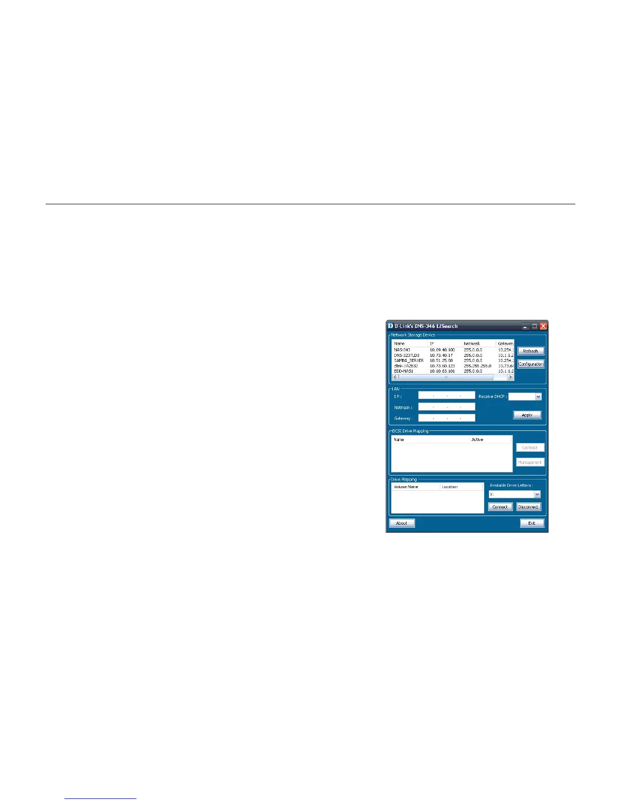 default it will have a self-assigned IP address of 192.168.0.32. It is recommended to use the included D-Link Easy Search Utility when accessing and configuring the DNS-346