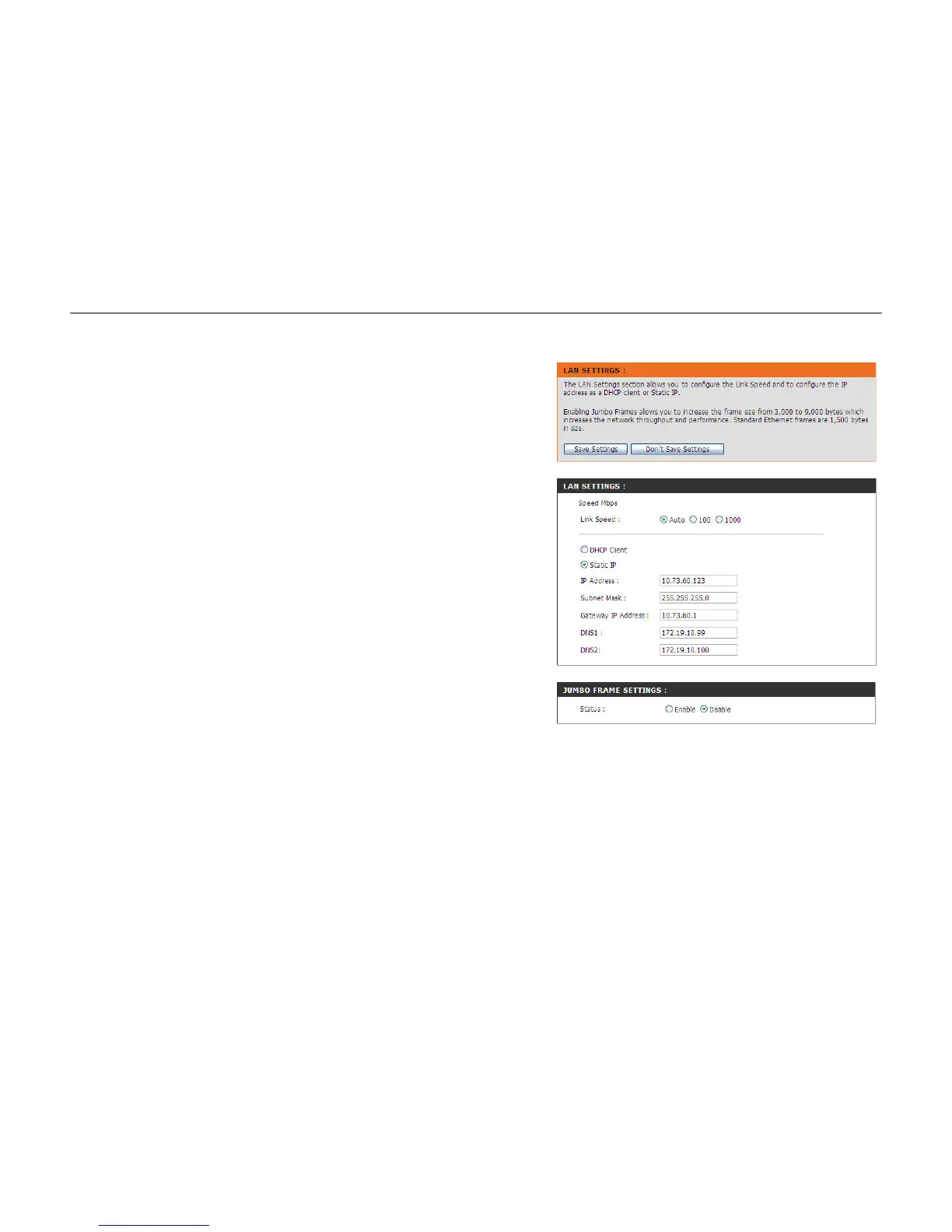 The LAN Settings section allows the user to configure the link speed and to configure the IP address