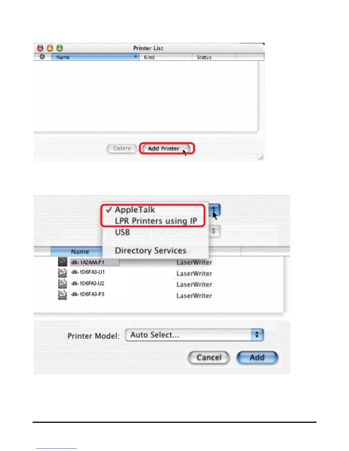 Select the printing protocol preferred, AppleTalk or LPR Printers using IP.