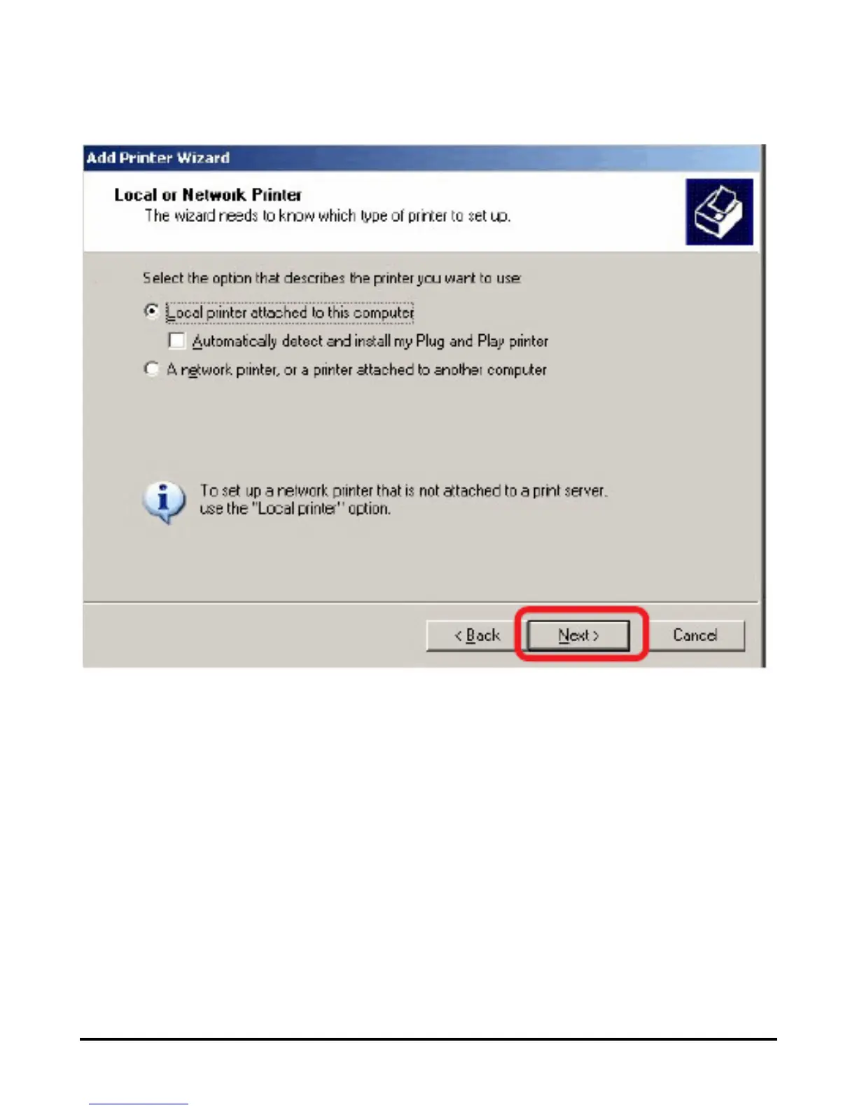 Select the first option, Local printer attached to this computer, and click Next.