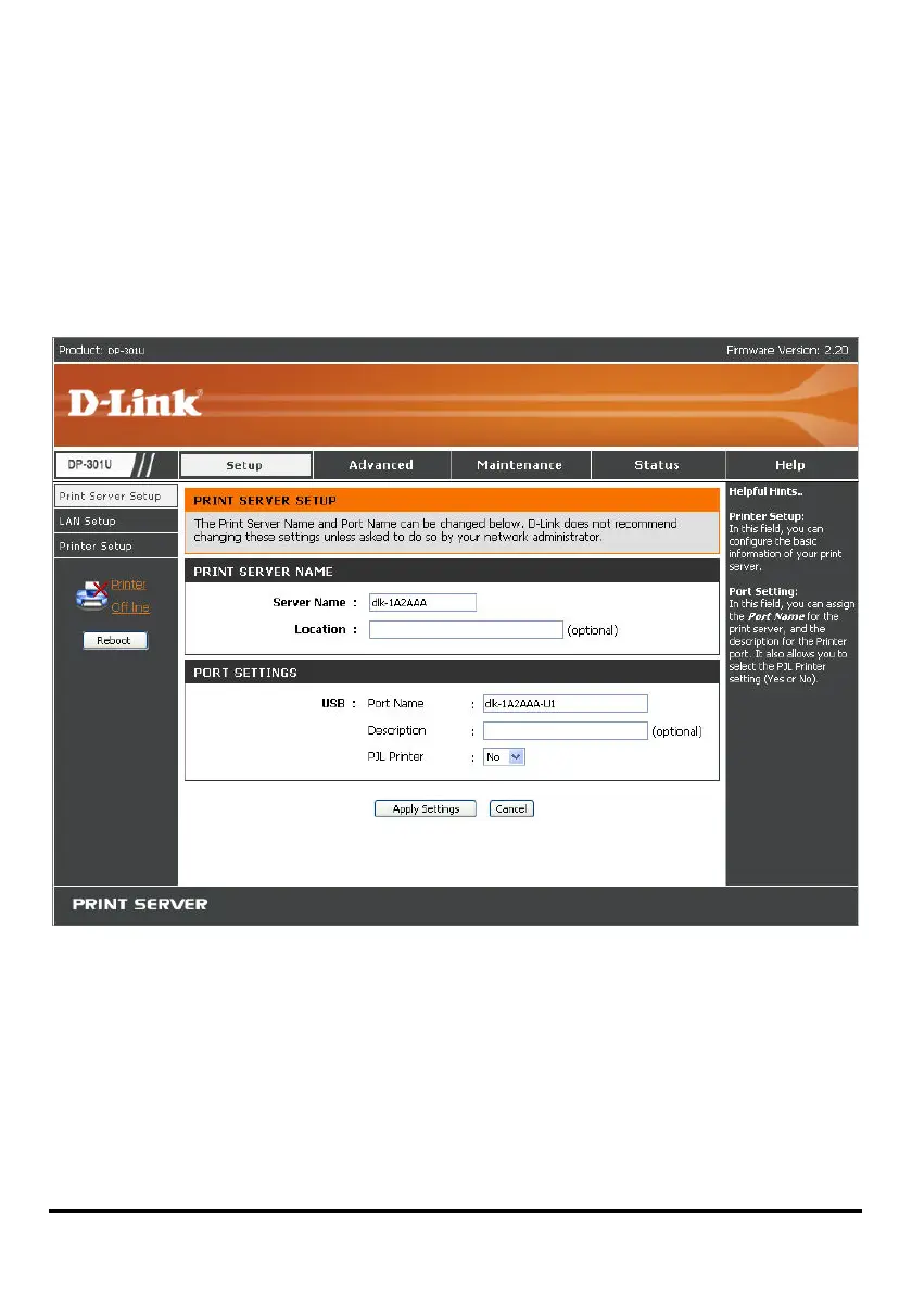 The Print Server Setup screen allows you to modify the Print Server Name and