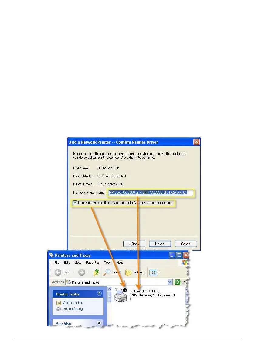 Next> button to continue. Then the printer (e.g. HP Laser 2000 used in this