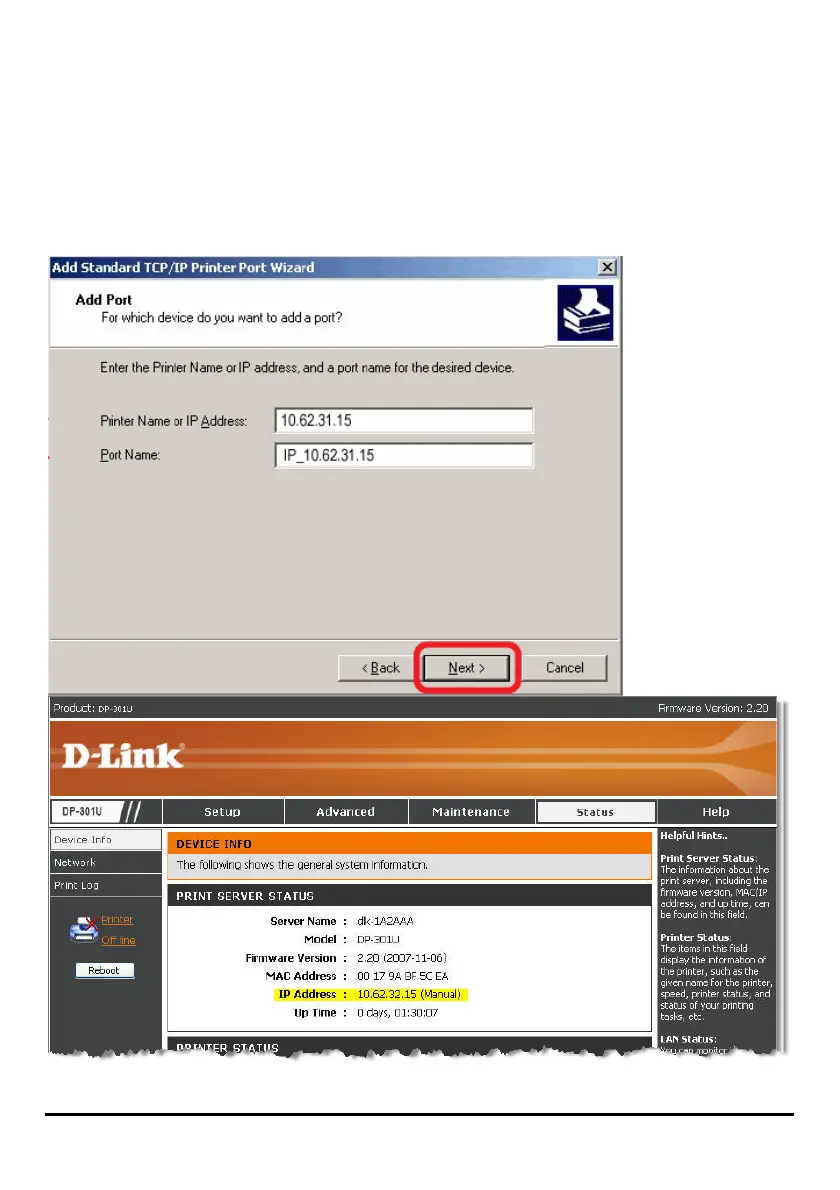 Type the IP address of the print server (e.g. 10.62.31.15 used in this manual),