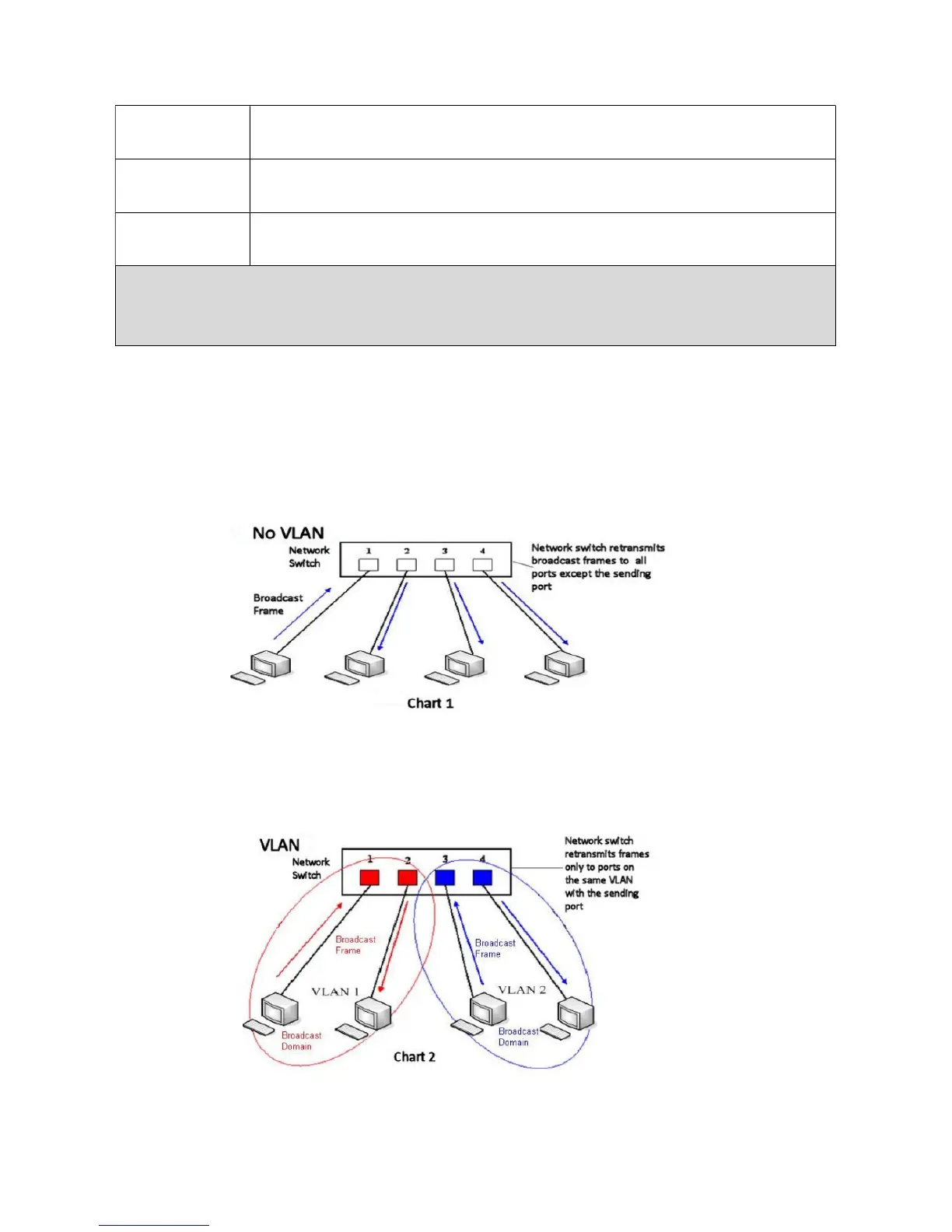 Chart 1 shows a network switch with no VLAN. Any broadcast frames will be transmitted to