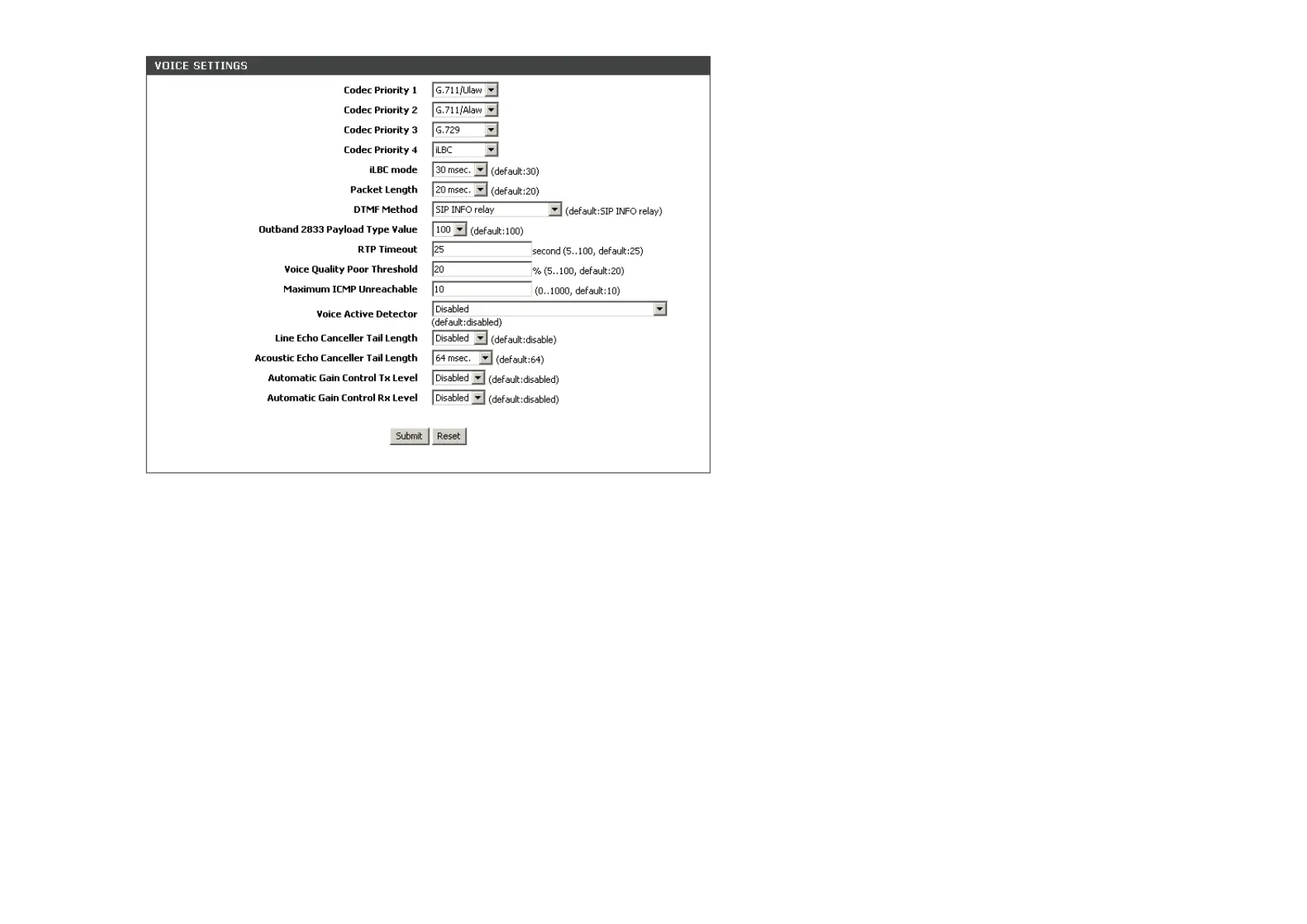 Packet Length: RTP payload length. Selects a length from the pull-down menu, default setting is 20 msec.