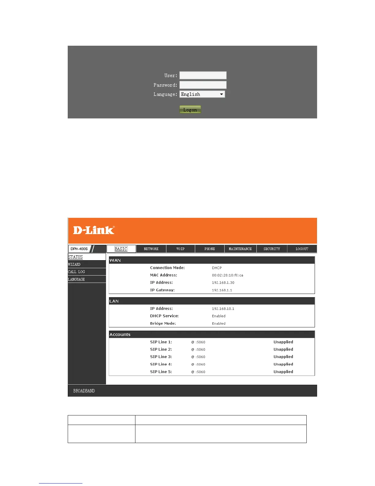 D-Link DPH-400S - Web Interface - Status Display