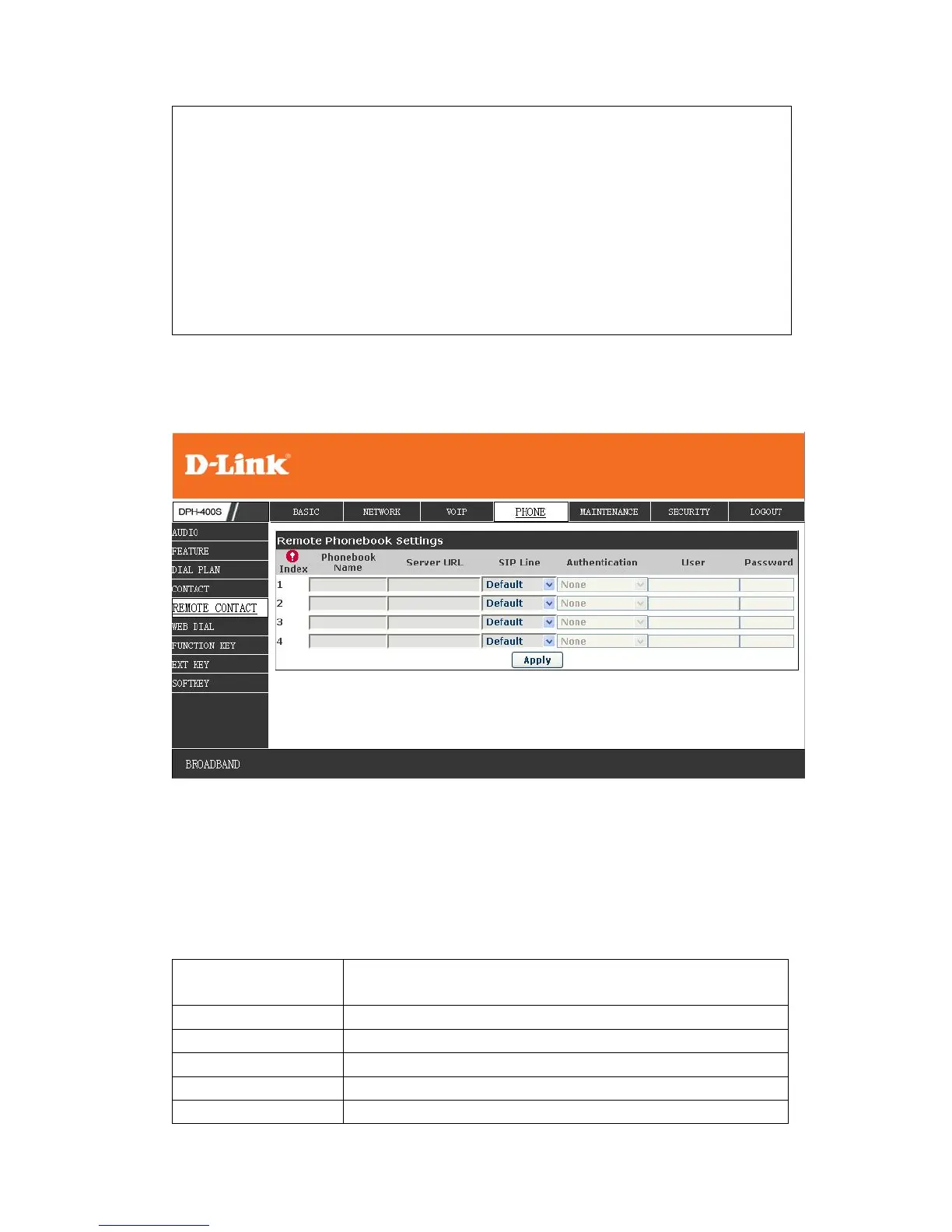For example: Set the Phonebook Name as Dlink, Server URL is