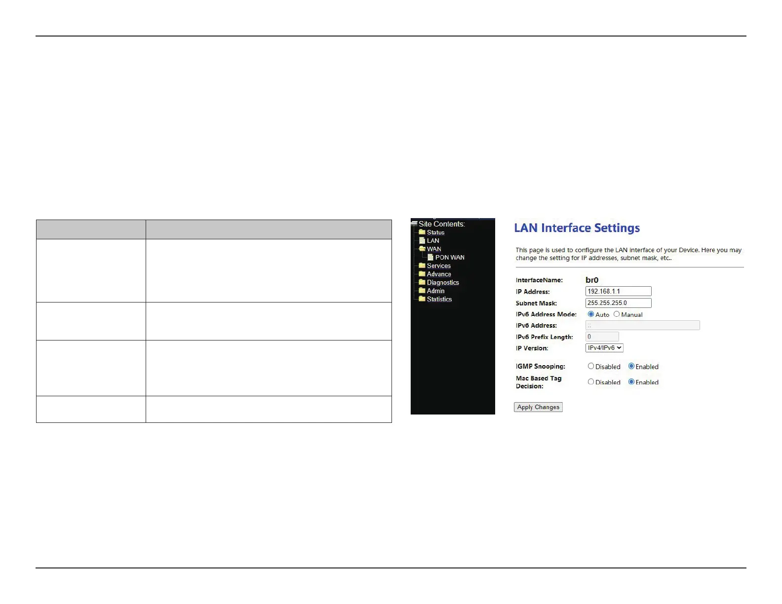 Choose LAN. The LAN tab that is displayed contains LAN and LAN IPv6. In LAN page, you can change IP address of the ONU. The default IP address