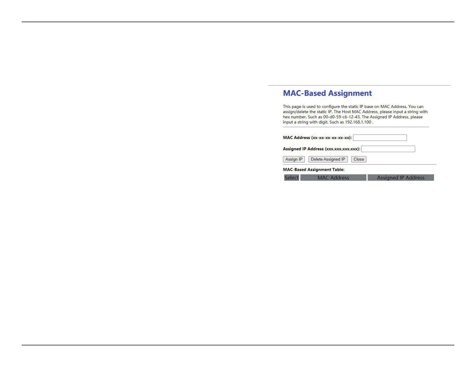 Choose Servies > DHCP > MAC-Based Assignment. The page as shown in the