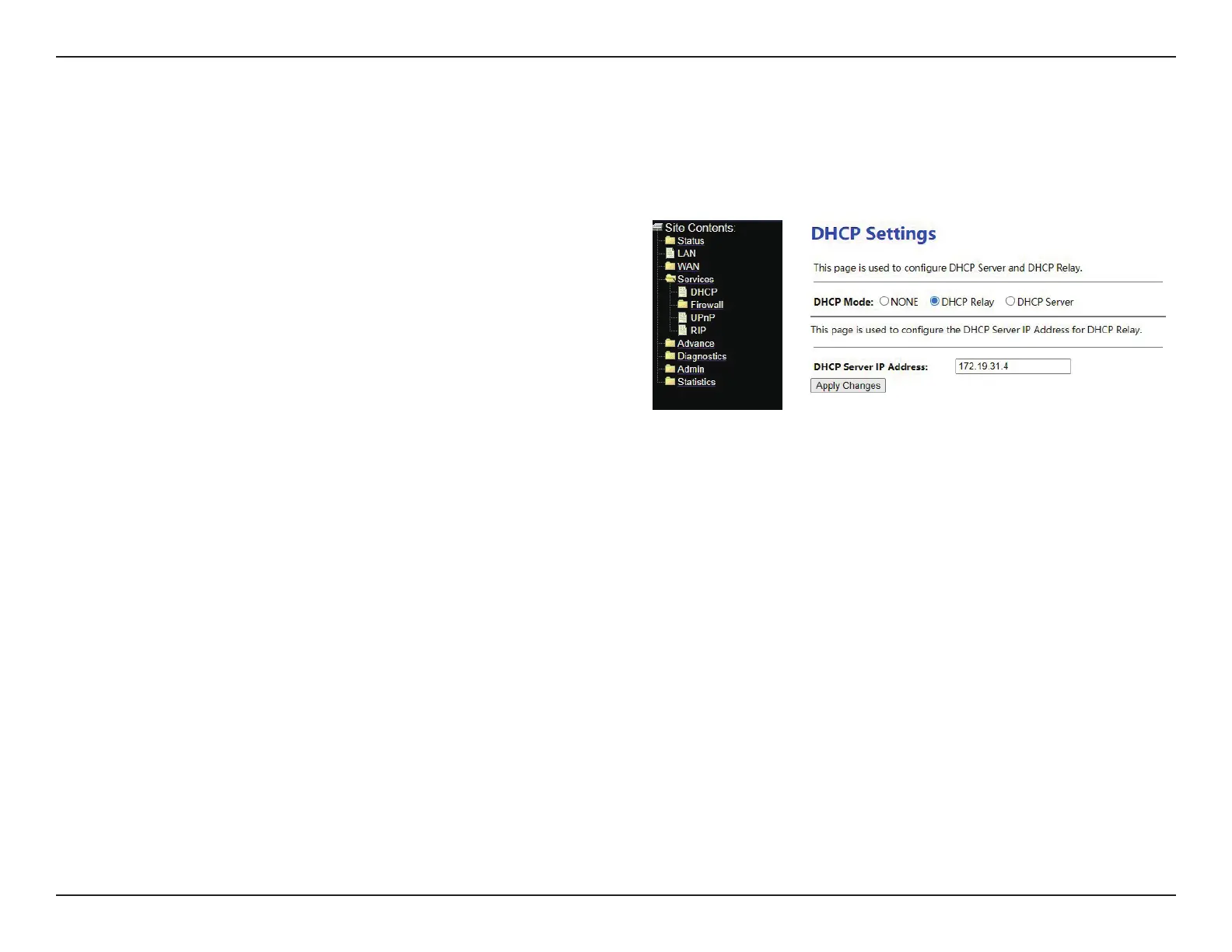 In the DHCP Mode eld, choose DHCP Relay, the page shown in the right