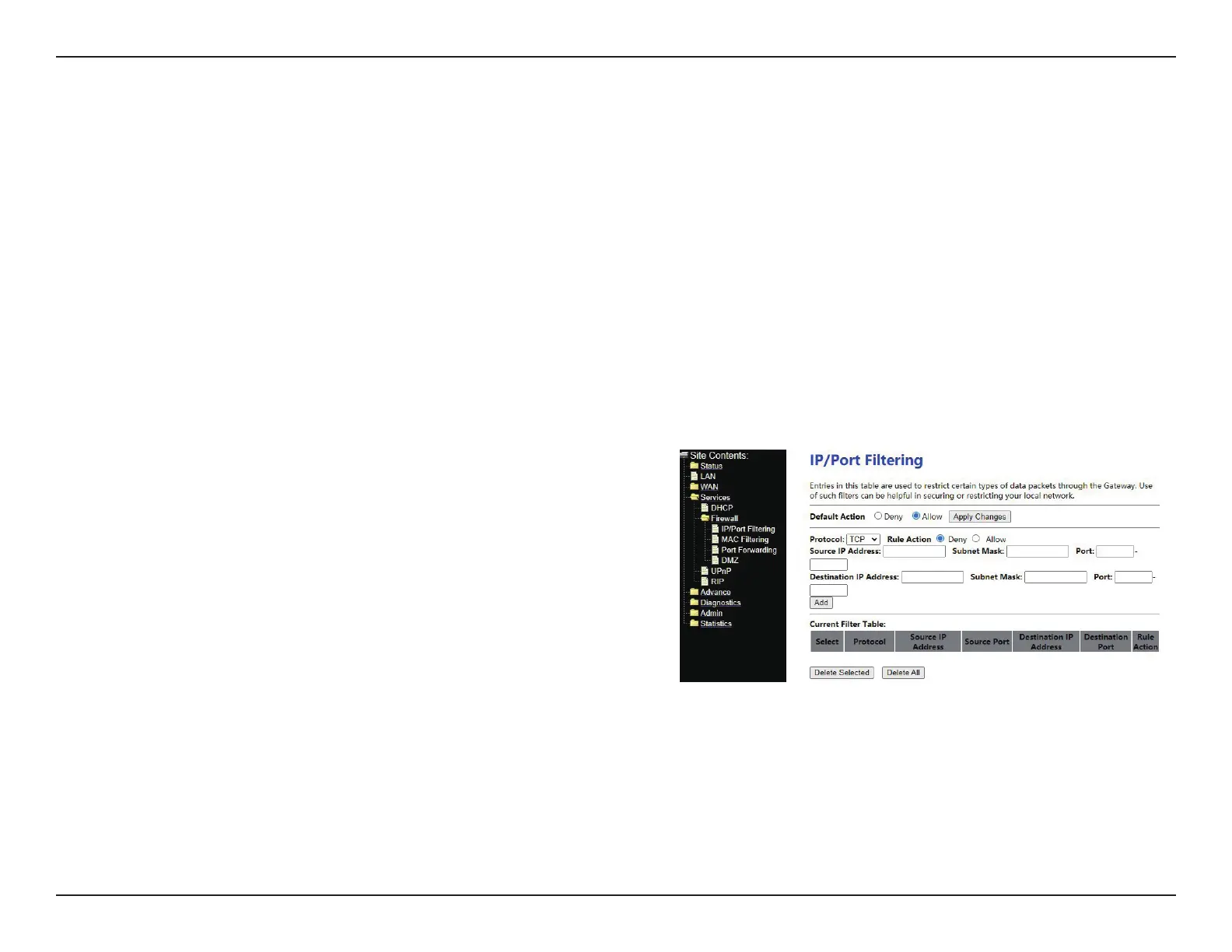 Click Services > Firewall, the page shown in the following gure appears. The Firewall page contains IP/Port Filtering, MAC Filtering, Port