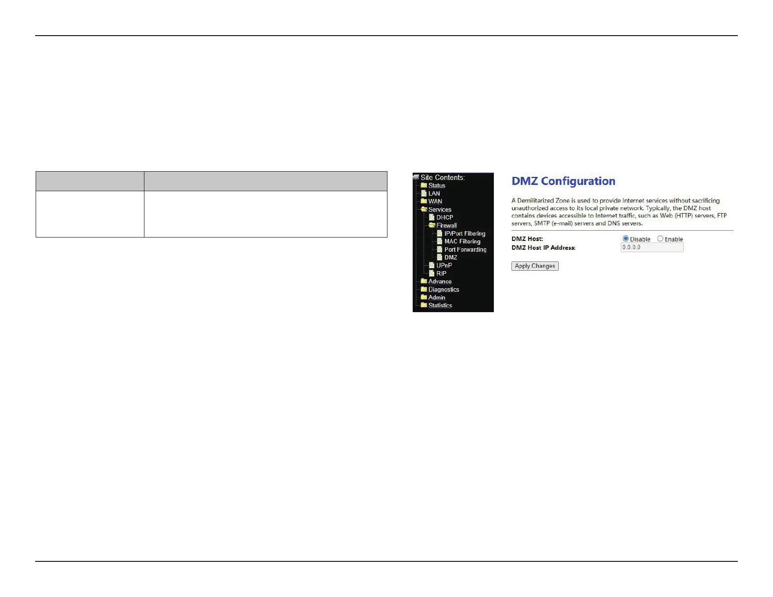 Click Services > Firewall > DMZ, the page shown in the following gure appears. A Demilitarized Zone is used to provide Internet services without