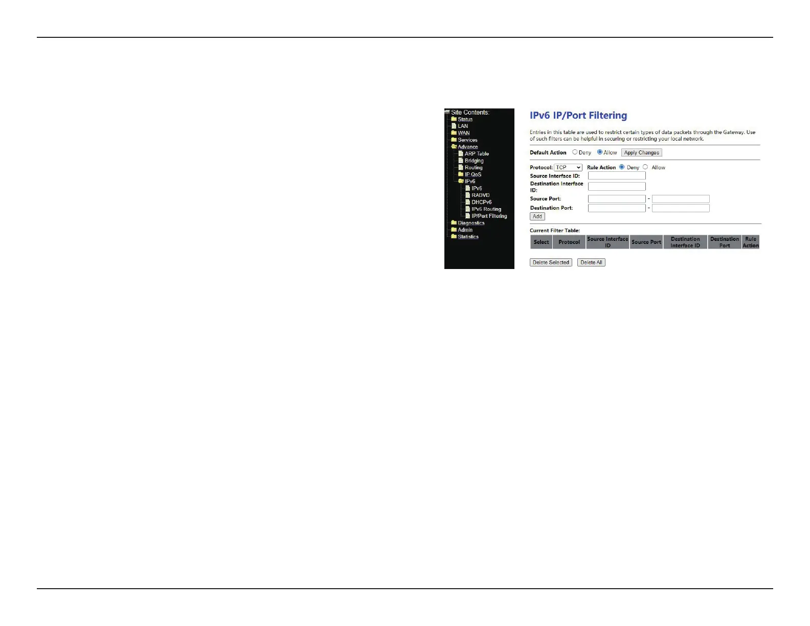 Choose Advance > IPv6 > IP/Port Filtering, the page shown in the right