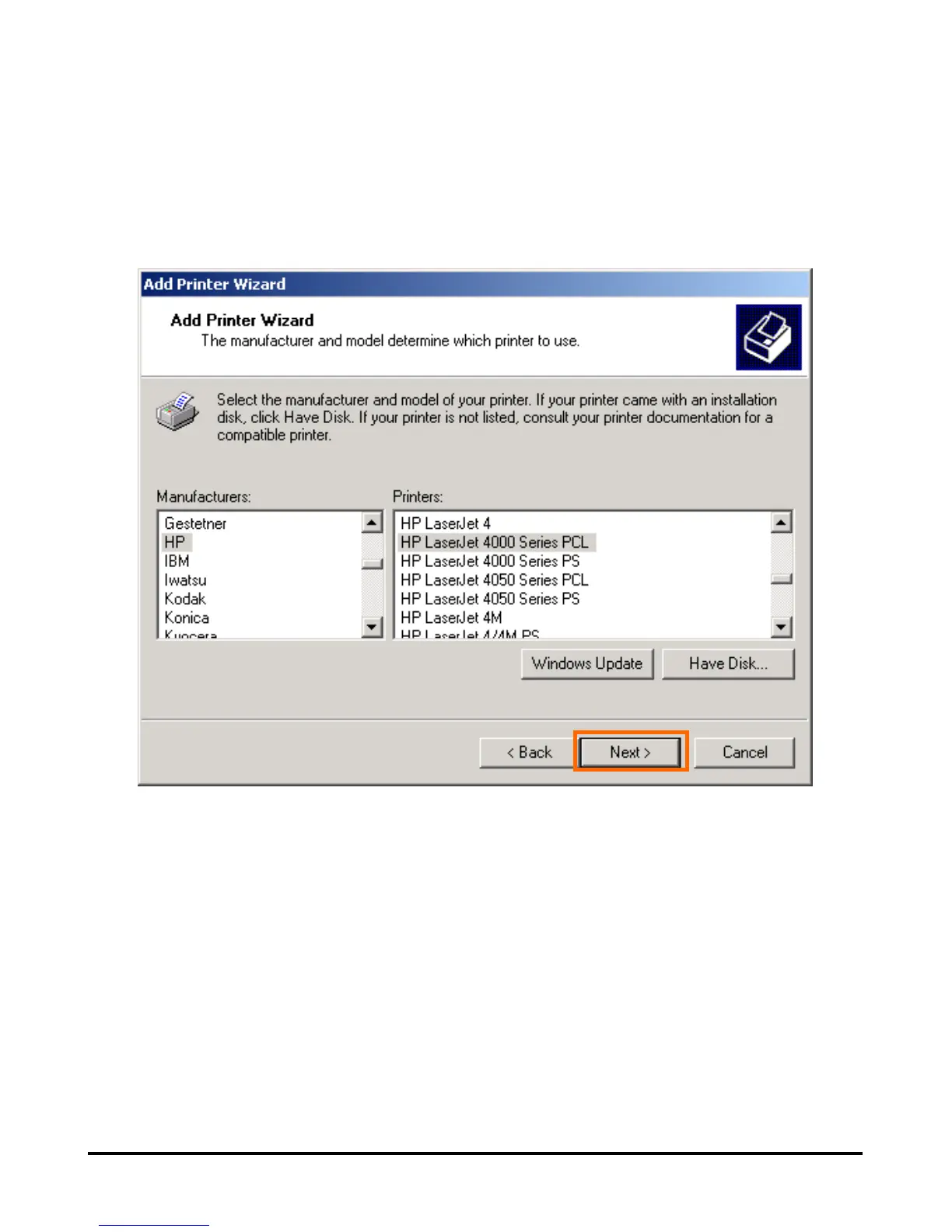 click [Have Disk] and insert the printer driver disk that came with your printer to