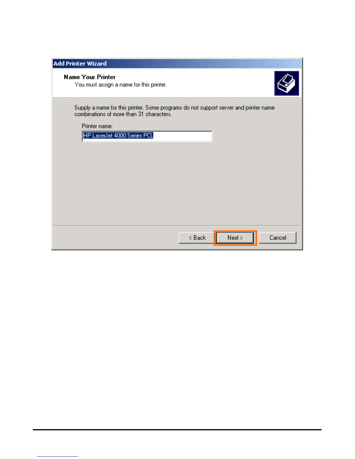 At this screen, input a name for the printer, and then click Next >.