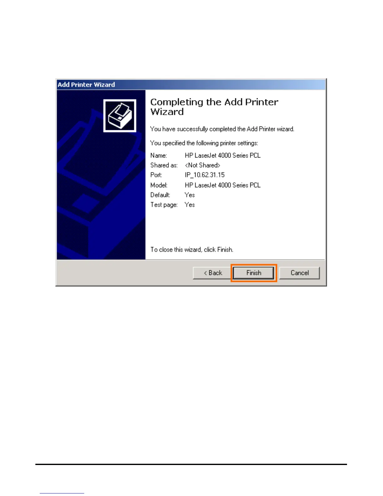 Click Finish. The printer is now ready for printing with Windows 2000 on your