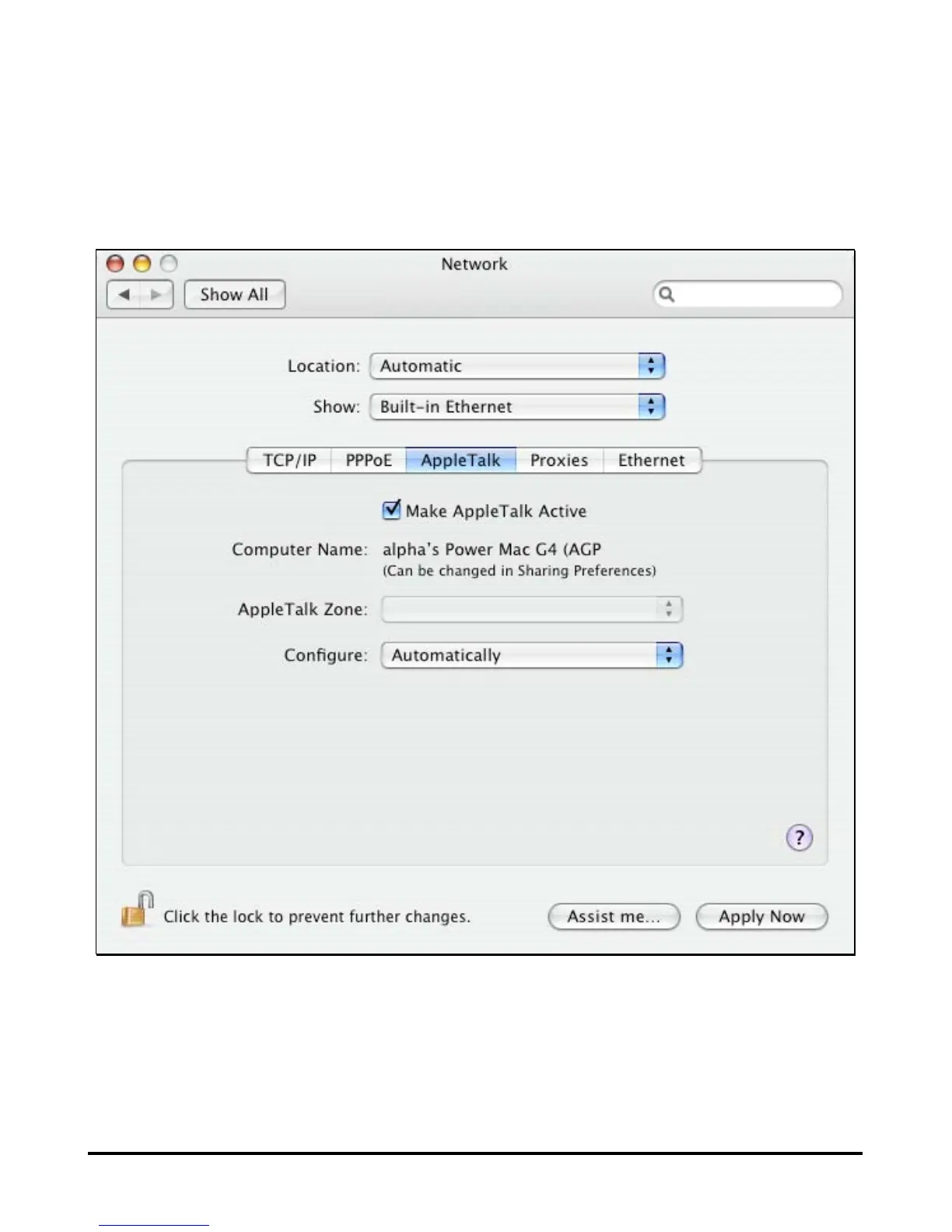 Select the Apple Talk tab in the Network menu. Check the box labeled Make Apple