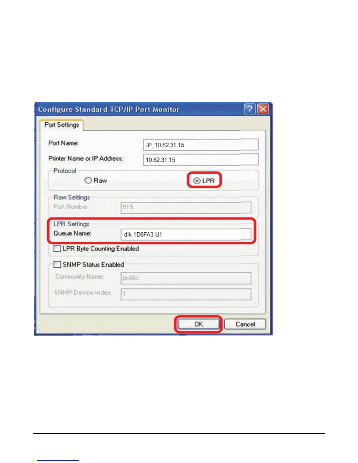 MFP server’s Web configuration, in the LPR Settings field. Click OK.