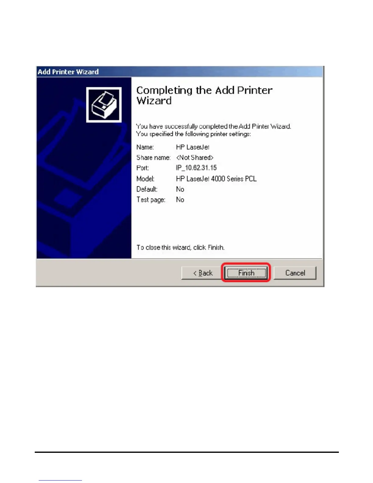 Click Finish. The printer is now ready for printing with Windows XP on your network.