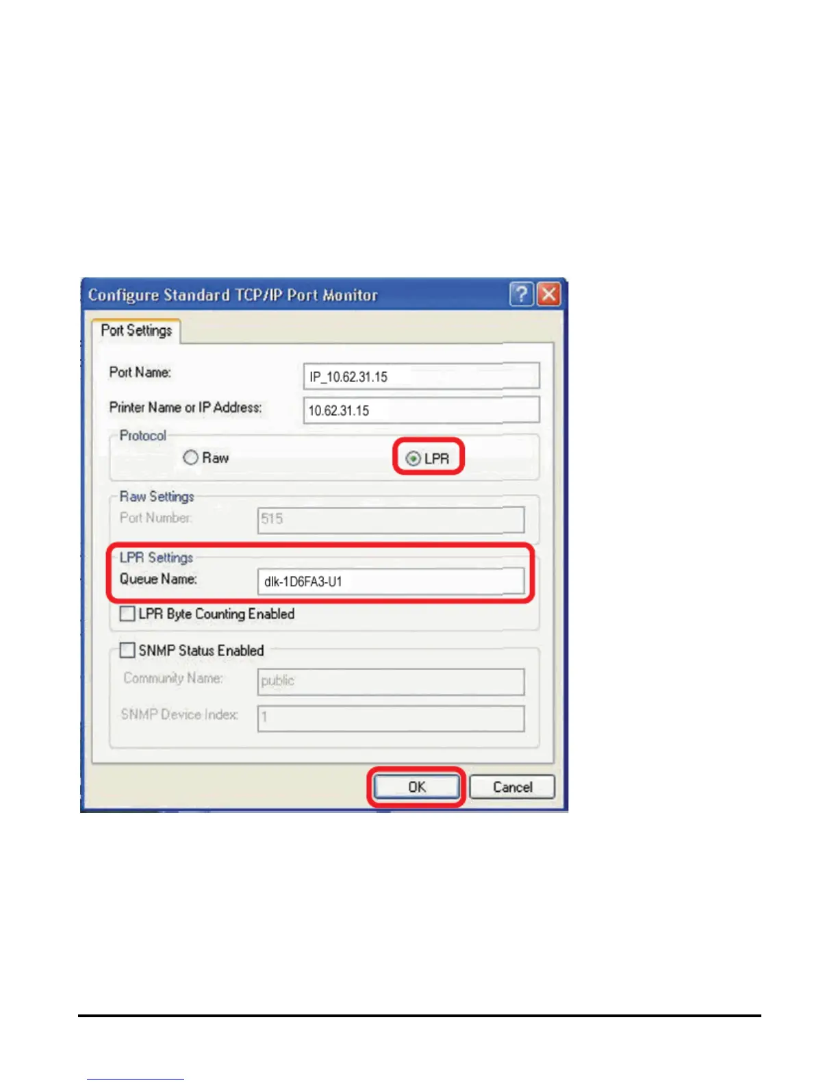 MFP server’s Web configuration, in the LPR Settings field. Click OK.