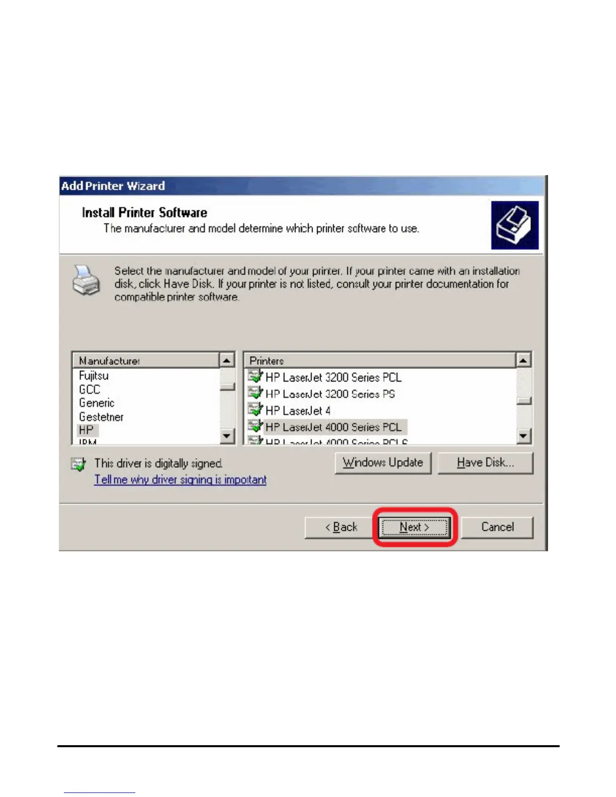 Highlight the printer, as shown. If the desired printer is not on the list, click Have Disk