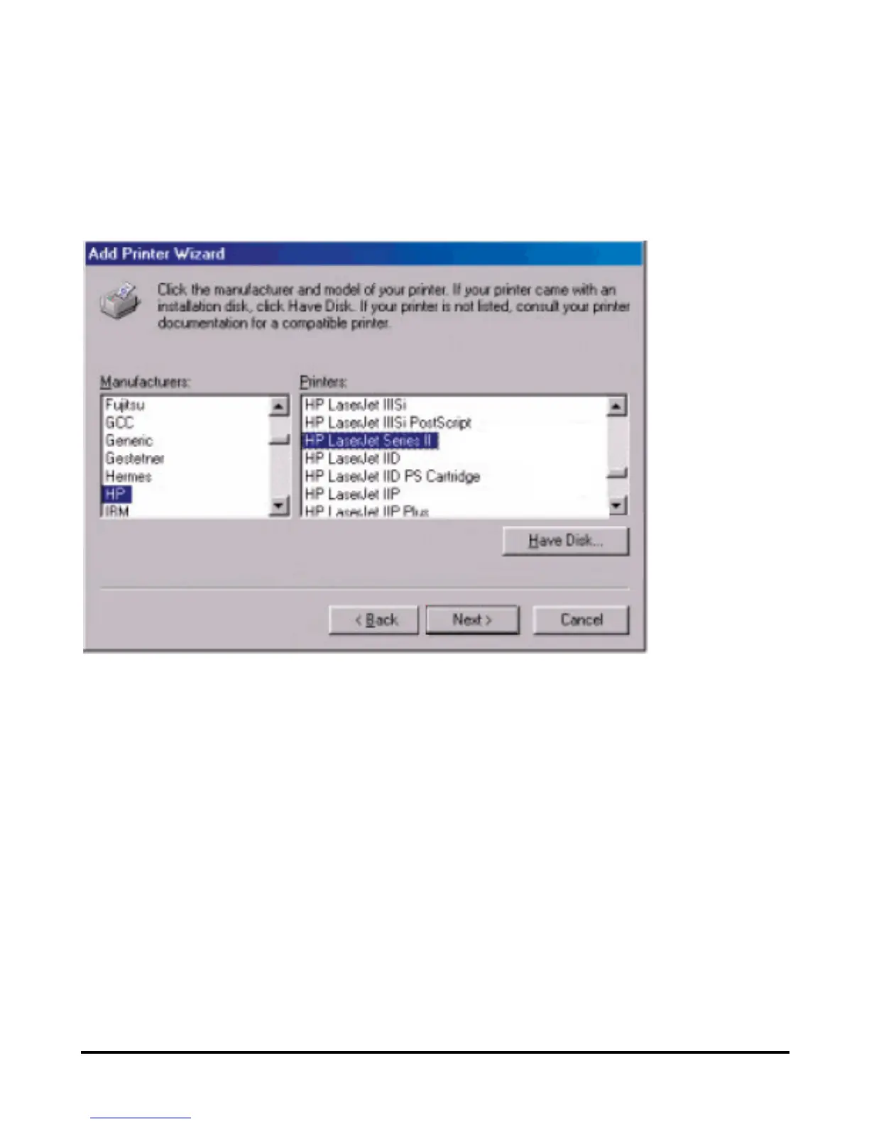 Highlight the printer, as shown. If the desired printer is not on the list, click Have Disk