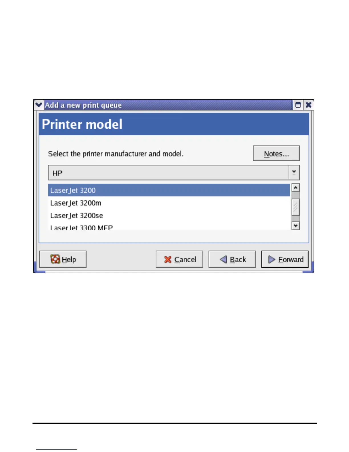 select manufacturer) pull-down menu, and the printer model from the sub-list. Click