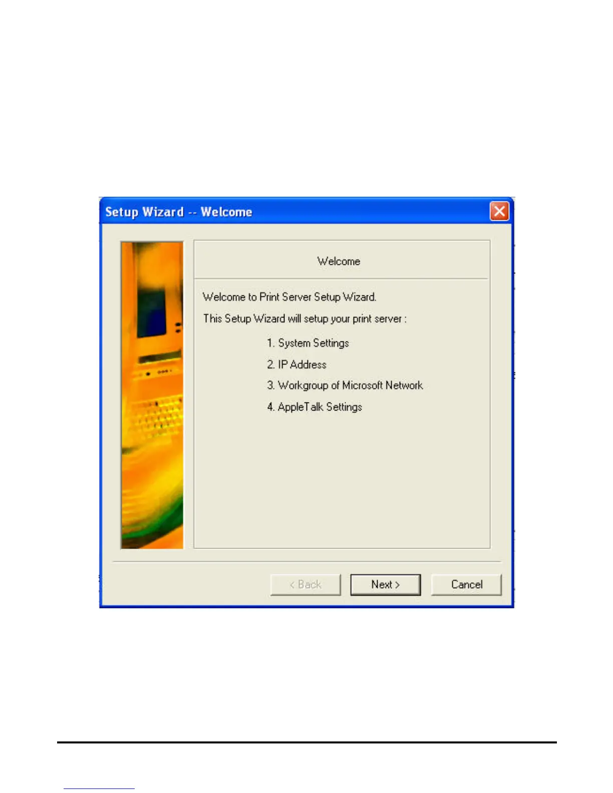 The Setup Wizard allows you to do a series of configuration of the MFP Server,