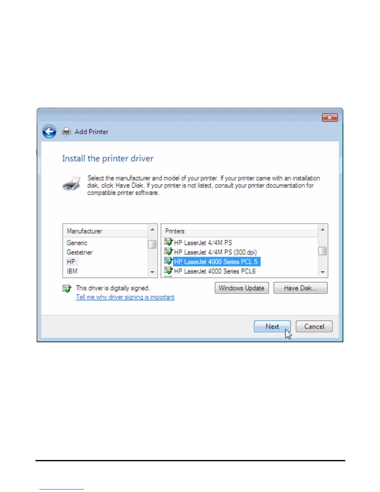 Highlight the printer, as shown. If the desired printer is not on the list, click Have Disk