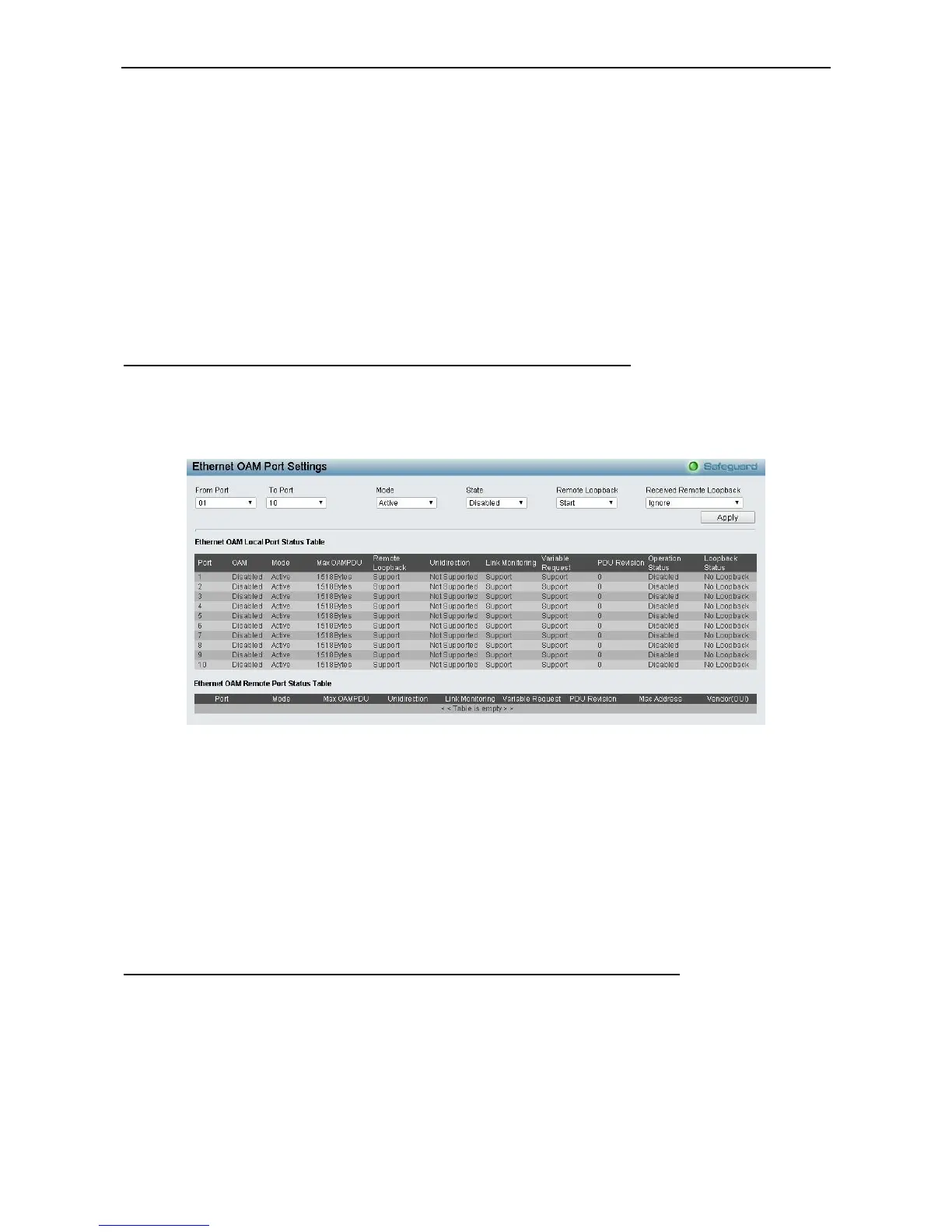 The Ethernet OAM Port Settings page allows you to configure the Ethernet OAM settings.