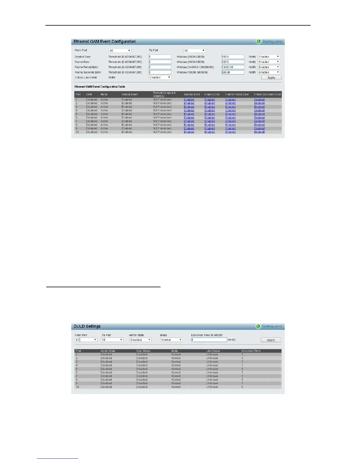 To view this window, click Configuration > DULD > DULD Port Settings, as shown below: