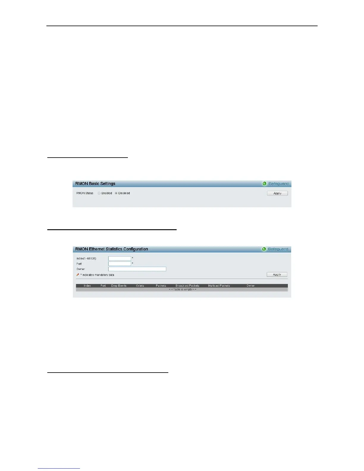 The RMON Statistics Configuration page displays the information of RMON Ethernet Statistics and allows