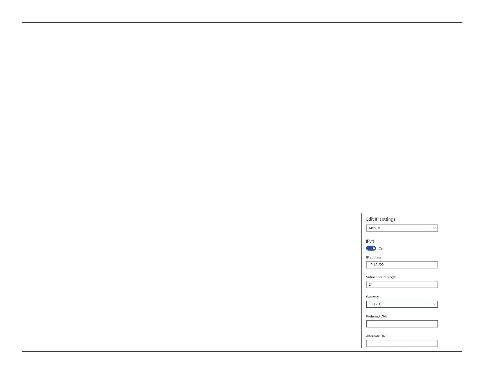 4. Under Edit network IP settings or Edit IP settings, select Manual. If IPv4 is selected, type the IP address settings in IP