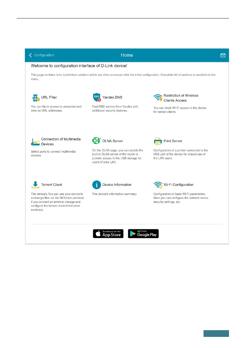 The Home page displays links to the most frequently used pages with device's