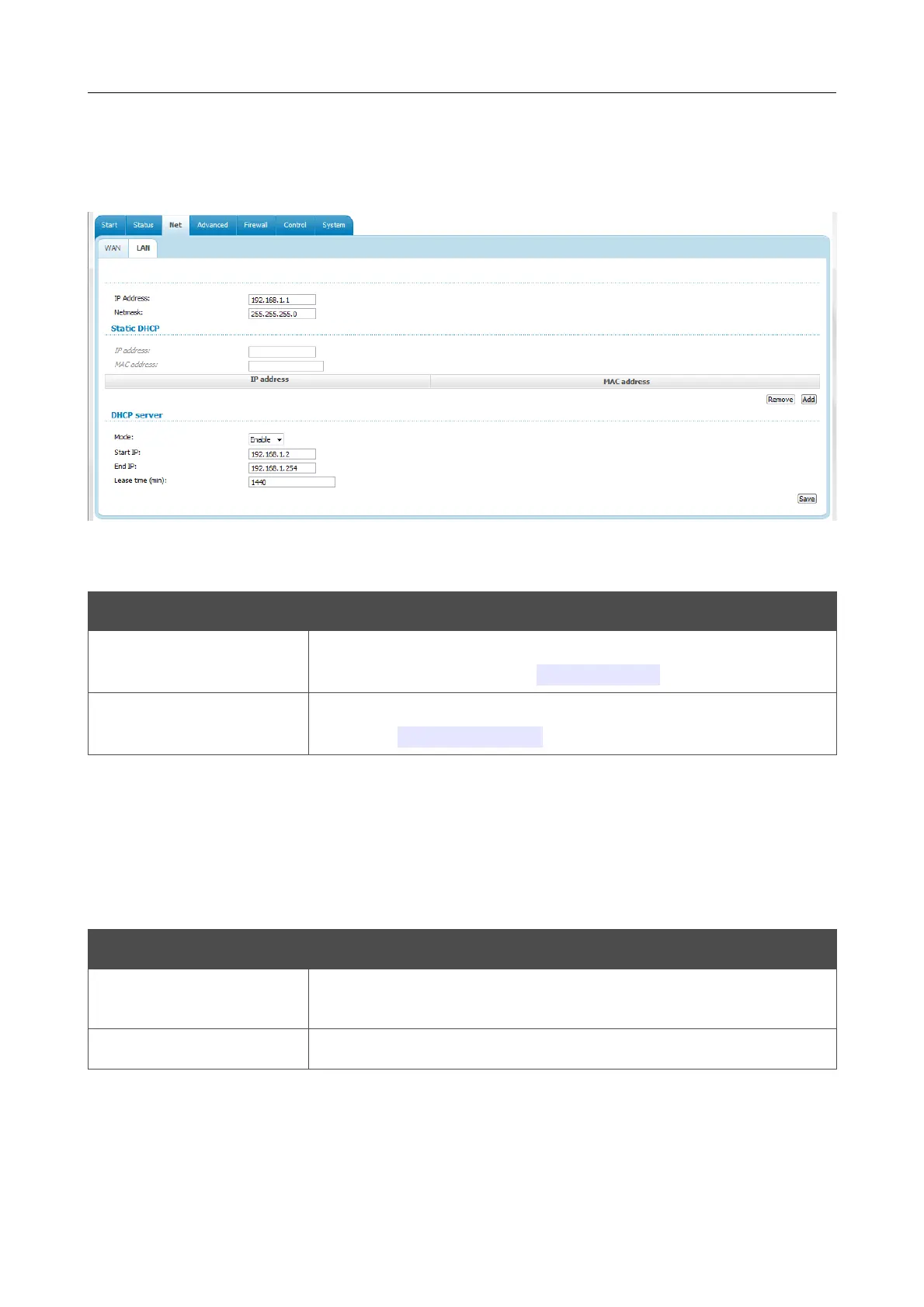 In the Static DHCP section, you can specify MAC address and IP address pairs (set a fixed IP