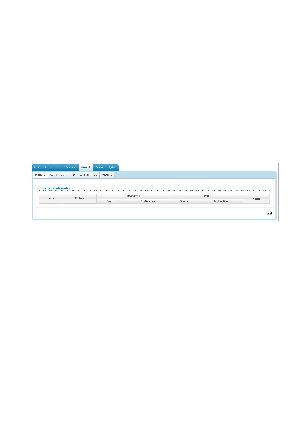 On the Firewall / IP filters page, you can create new rules for filtering IP packets and edit or