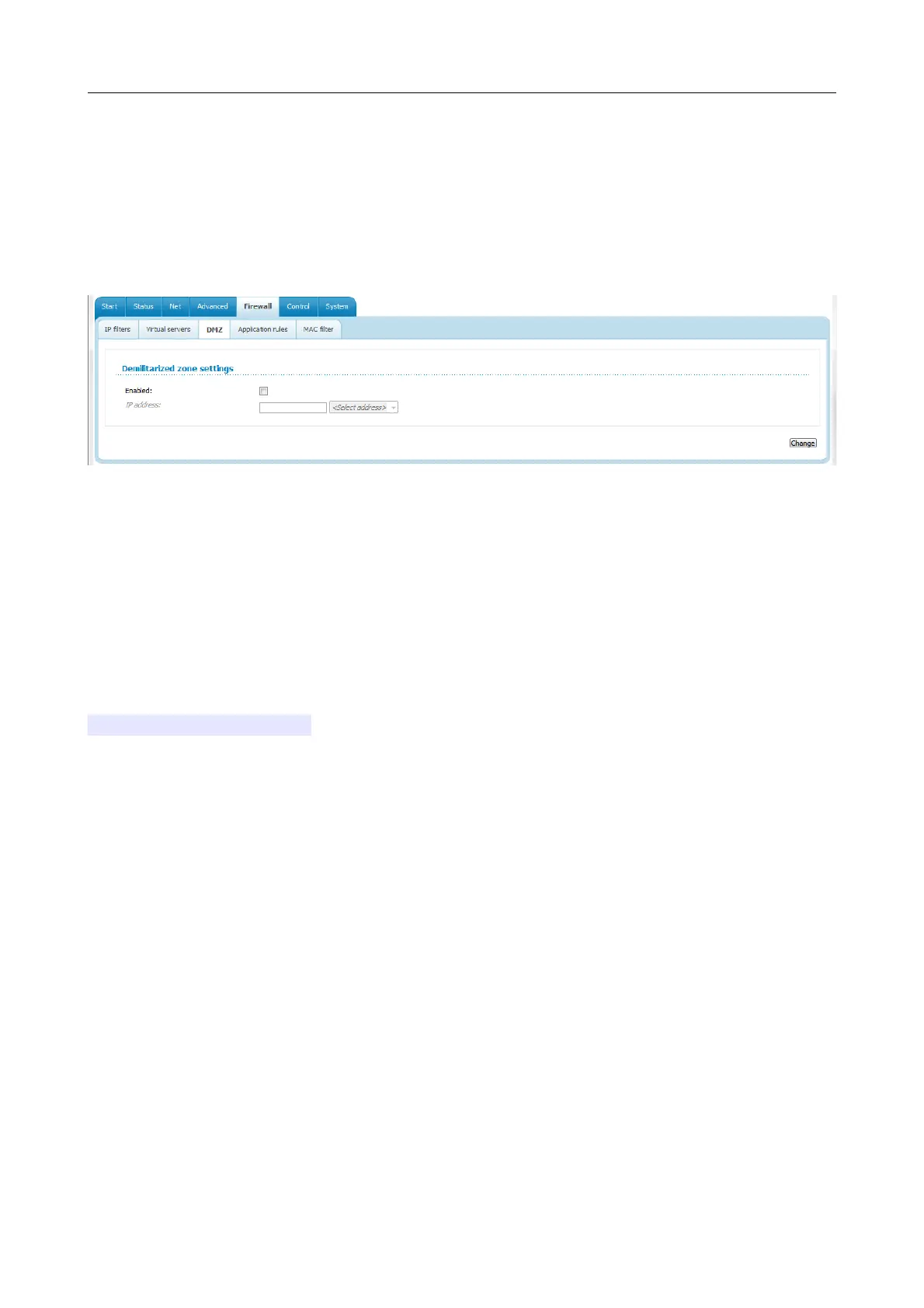 To disable the DMZ, deselect the Enabled checkbox and click the Change button.