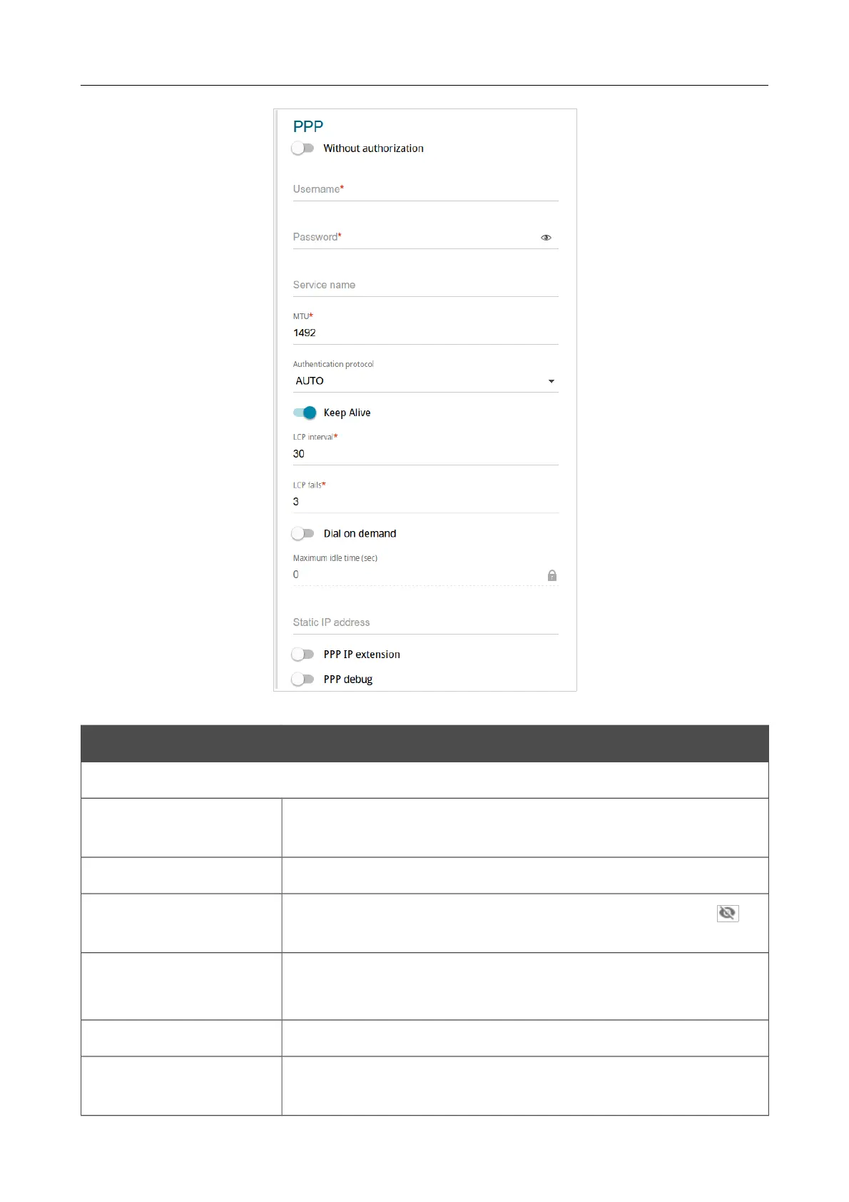 Figure 60. The page for creating a new PPPoE connection. The PPP section.
