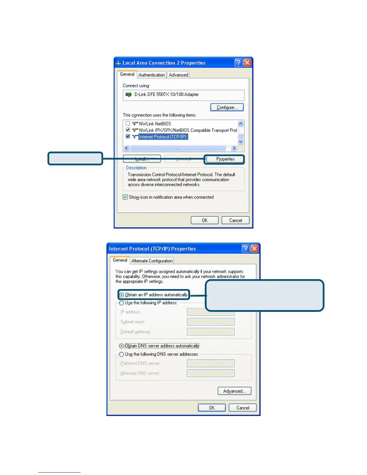 6. Select “Obtain an IP address automatically” by clicking once in the circle. Click the OK button