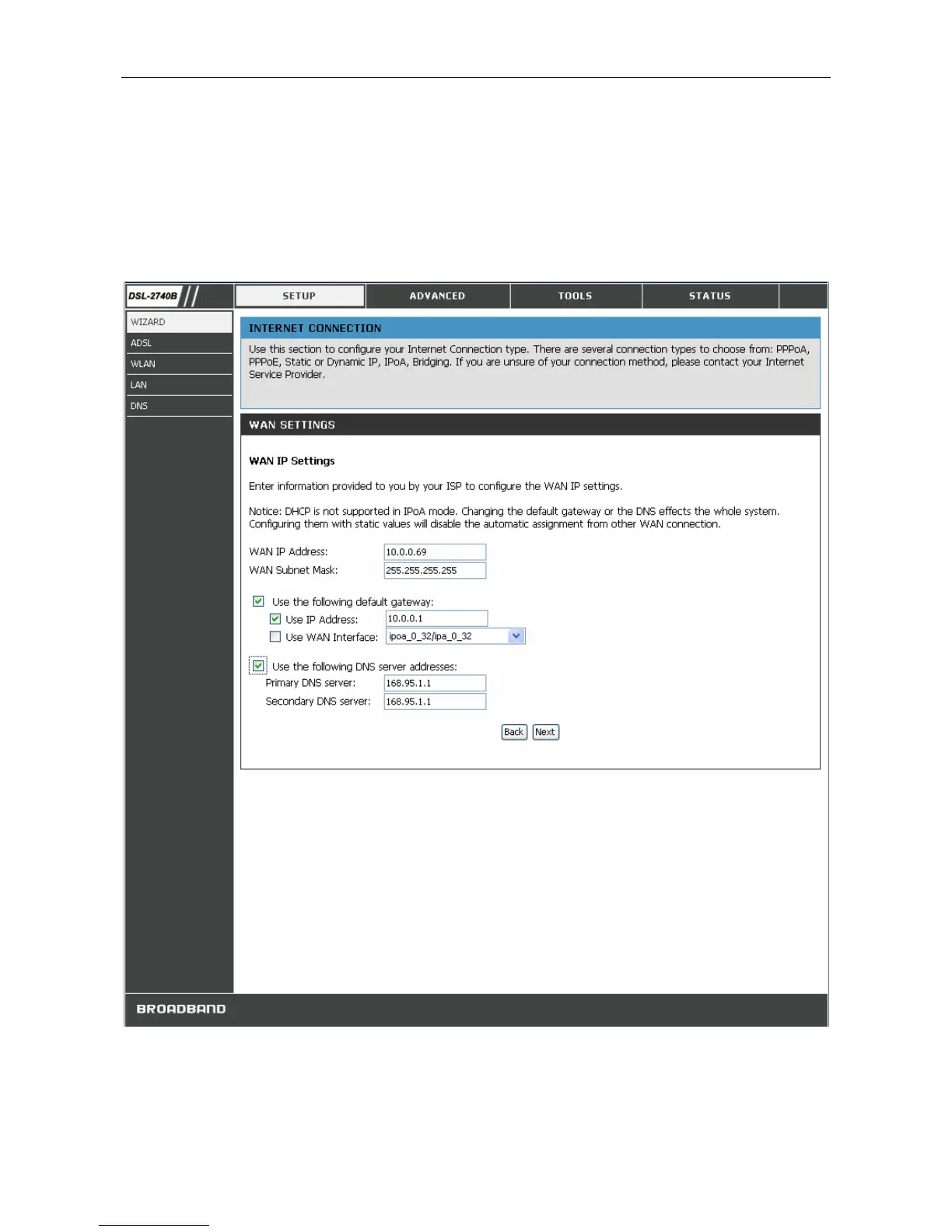 Using the Setup Wizard - For Static IP Address (IPoA) connection: