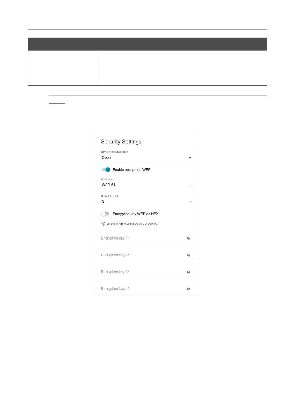 When the Open, WEP-64, or WEP-128 value is selected, the following settings are displayed on