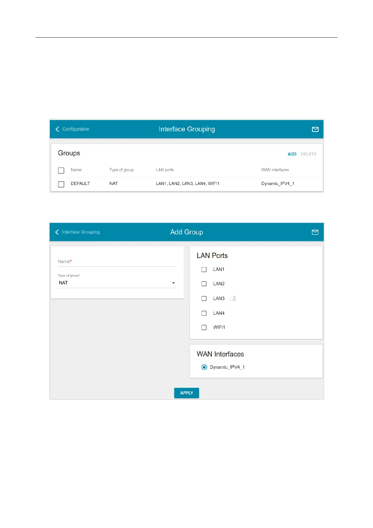 To create a new rule for interface grouping (a group of ports), click the ADD button.