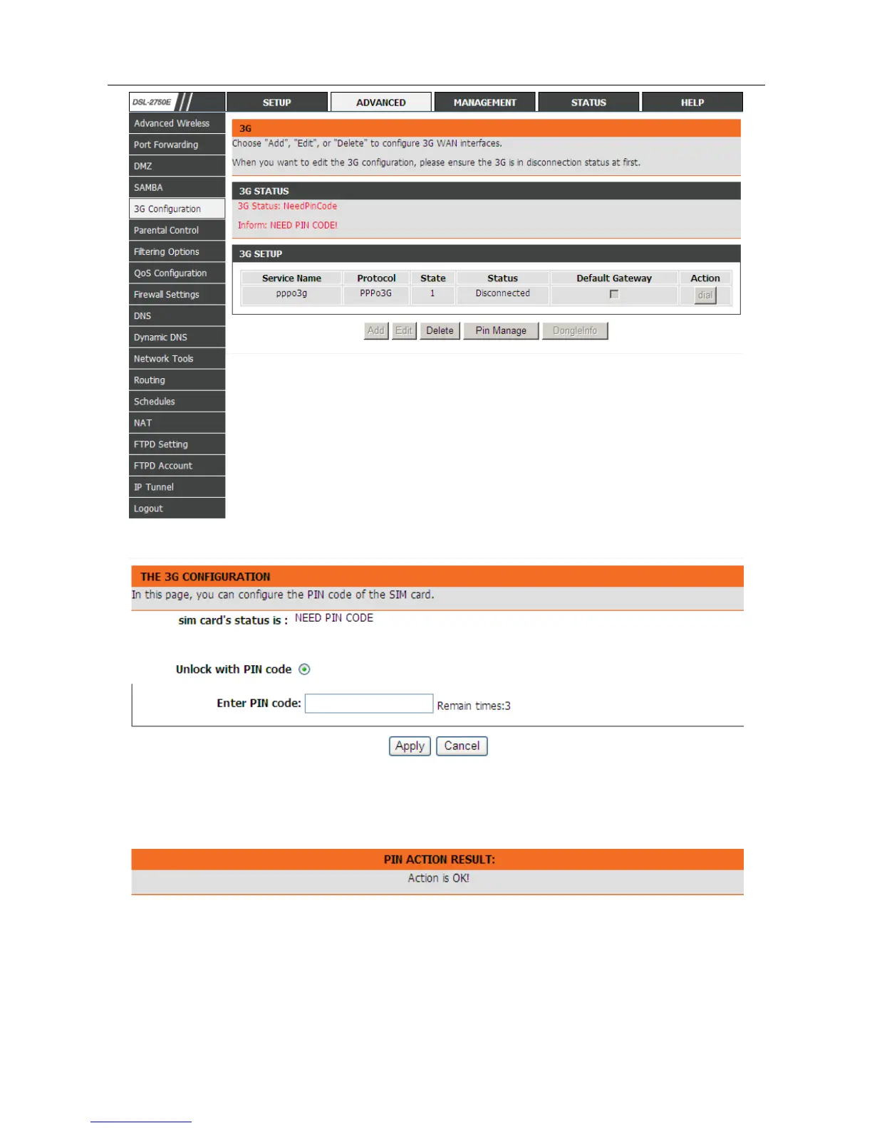 Step2 Enter the Pin provided by your ISP, then click Apply, the following page