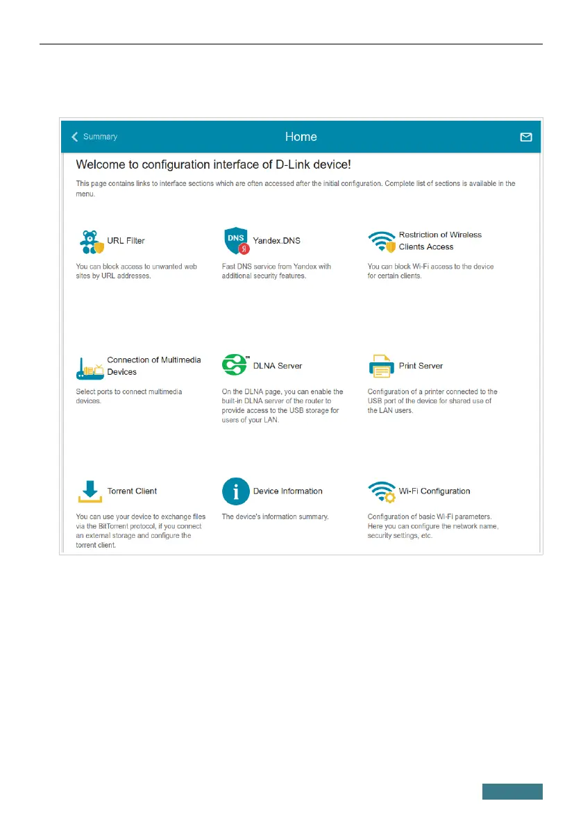 The Home page displays links to the most frequently used pages with device's