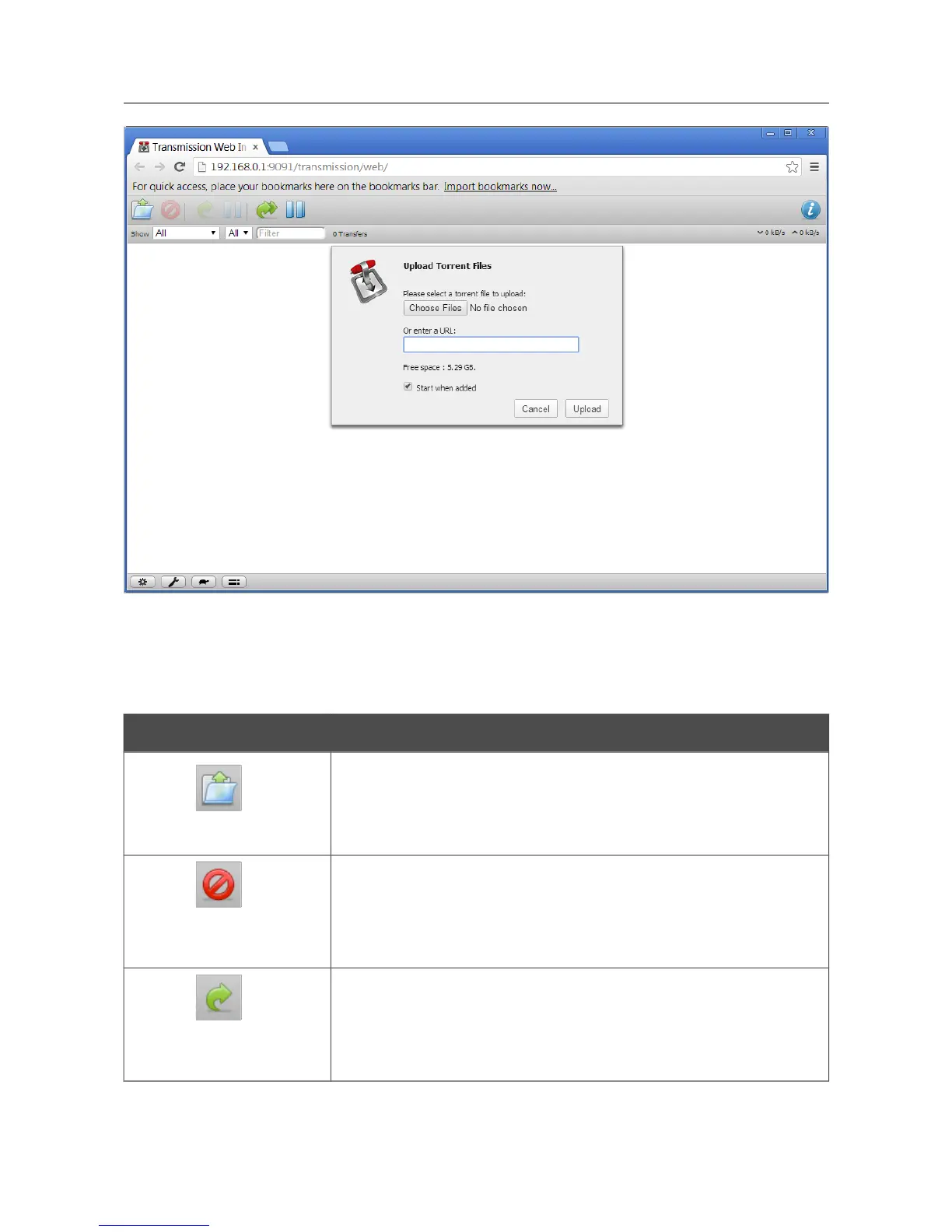 Using the web-based interface of the built-in Transmission torrent client you can manage the