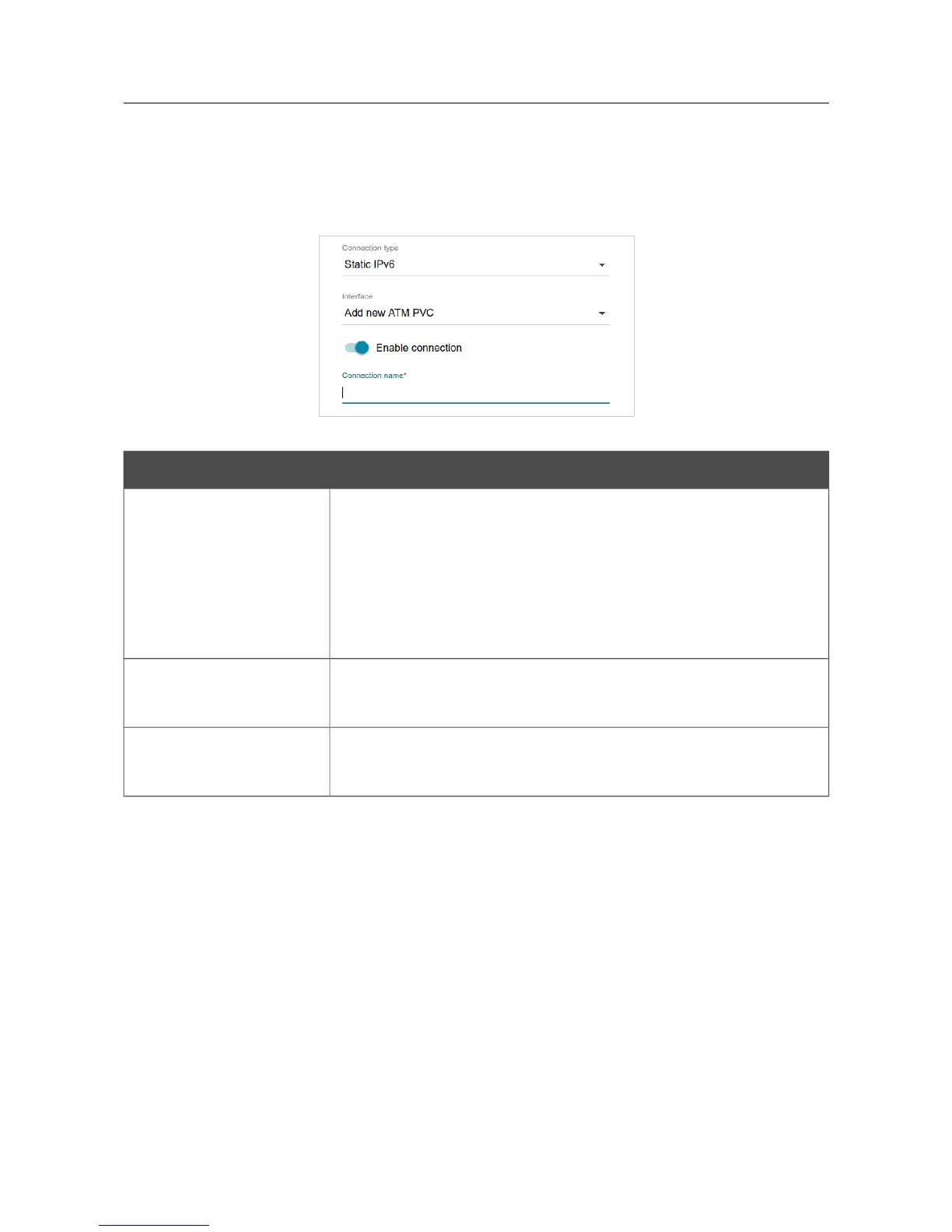Figure 56. The page for creating a new Static IPv6 connection. Selecting a connection type.