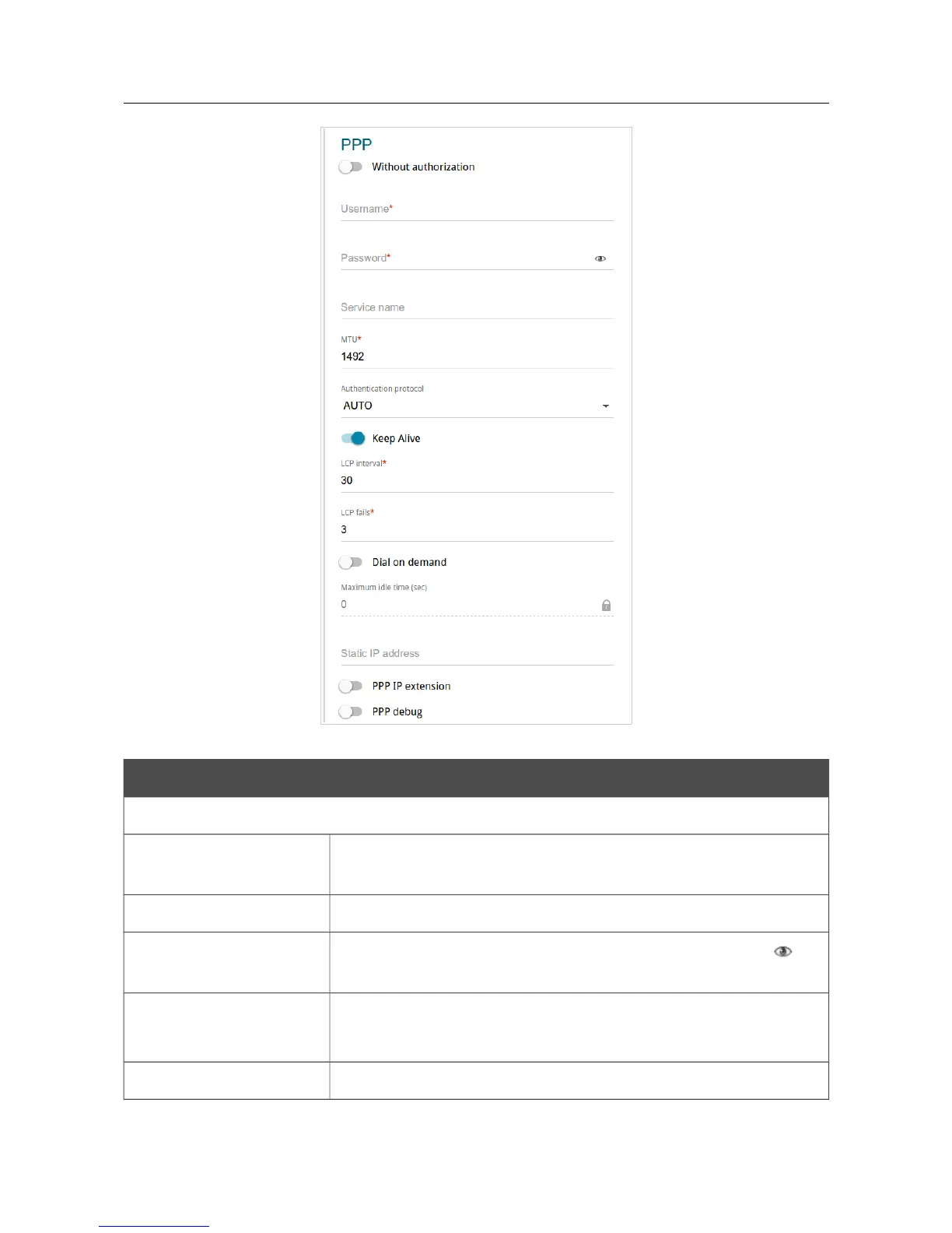 Figure 65. The page for creating a new PPPoE connection. The PPP section.