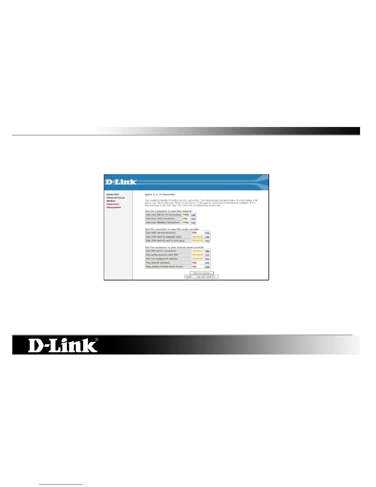 This router is capable of testing the DSL connection. The individual tests are listed below. If a test displays a fail status, click "Re-Run Diagnostic Tests" at the