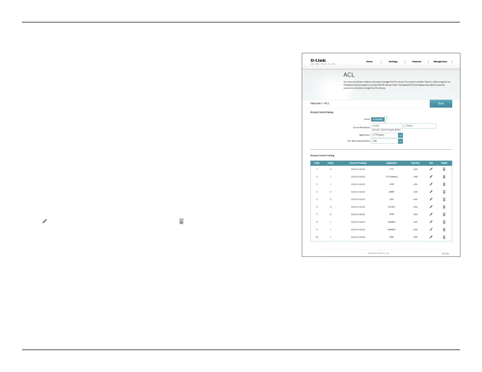 The Access Control List (ACL) page allows you to enable or disable various