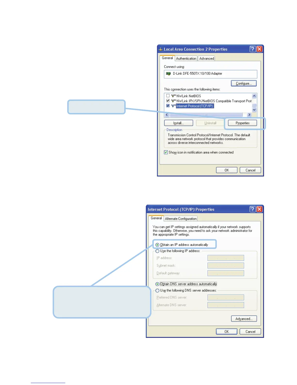 6. Select “Obtain an IP address automatically” by clicking once in the circle. Click the OK